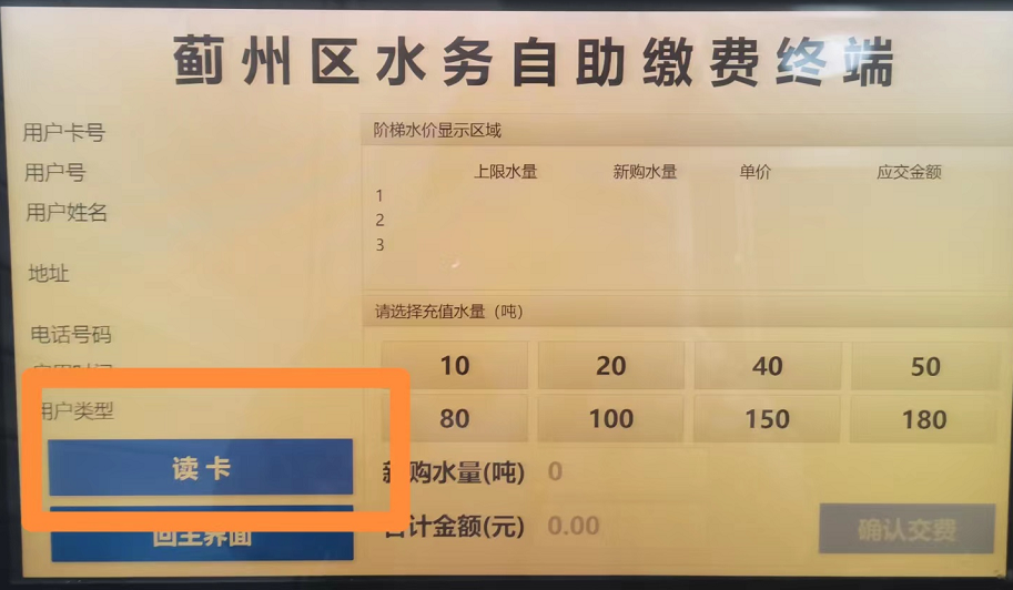 城区IC卡表缴费方法: 缴费方式: 1、柜台缴费:提供水卡,现金、微信、支付宝、刷卡、支票、电汇等方式缴费。 2、缴费机缴费:将水卡放到读卡区,如图 点击IC卡充值,如图 点击读卡,如图 语音提示核对用户信息,如图
