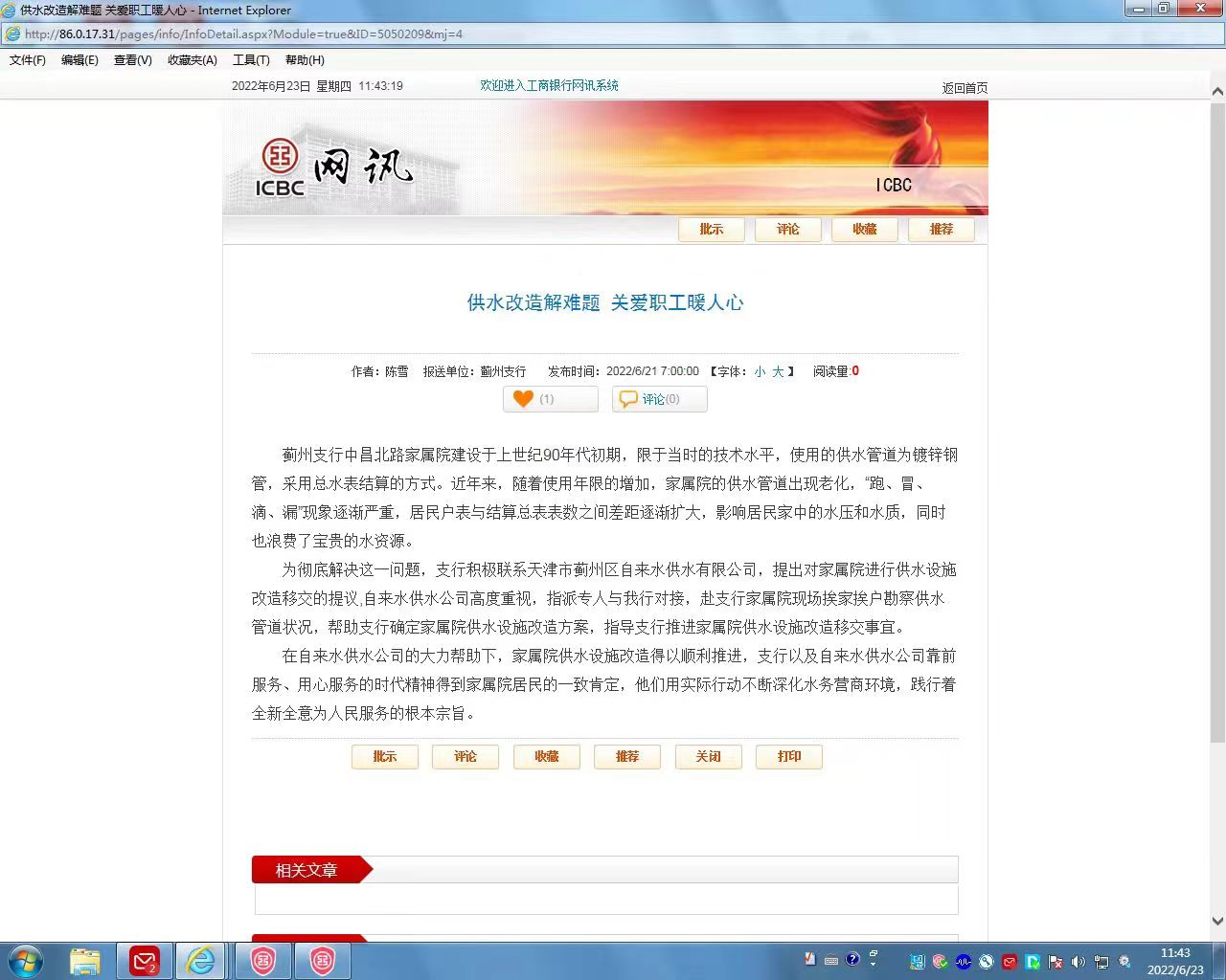 为彻底解决工行家属院的供水问题,工商银行天津市蓟州区支行联系我公司提出对家属院进行供水设施改造移交的提议。我公司高度重视,立即指派专人与工行对接,向工行工作人员耐心讲解相关政策及办理流程。主动赴工行家属院现场挨家挨户勘察供水管道状况,帮助工行确定家属院供水设施改造方案,指导工行推进家属院供水设施改造移交事宜,使工行天津蓟州区支行家属院改造实现了“零资料”和“零跑腿”,用实际行动践行全心全意为人民服务的宗旨,获得了工商银行的认可。工商银行于2022年6月21日在工商银行网讯系统以“供水改造解难题 关爱职工暖人心”为题对该家属院改造的相关情况进行了刊登报道。